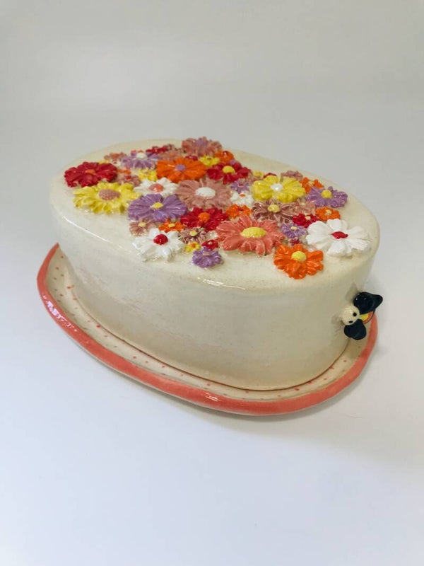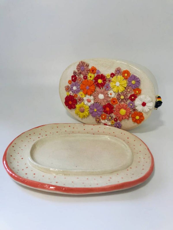 Beurrier ovale en grès engobé et émaillé, parsemé de fleurs des champs sur le couvercle. Longueur 17 cm largeur 14 cm et hauteur 10 cm.